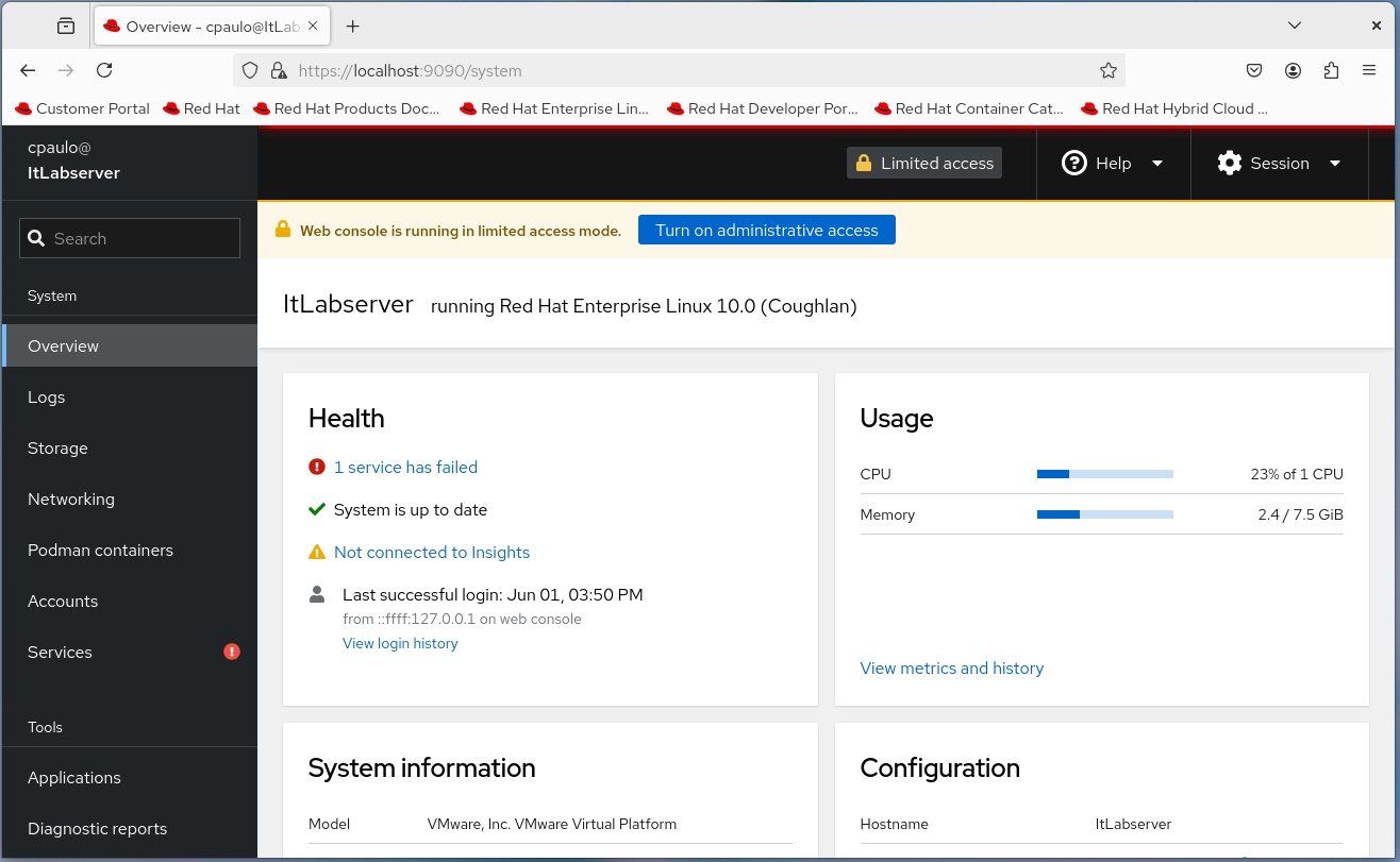 Com o Cockpit instalado e acessível, você agora tem uma interface web prática e segura para monitorar e administrar seu servidor Linux. A ferramenta simplifica tarefas como gerenciamento de serviços, rede, atualizações, usuários e muito mais — tudo sem depender exclusivamente do terminal. Ideal para ambientes de teste, produção ou estudos em servidores RHEL.