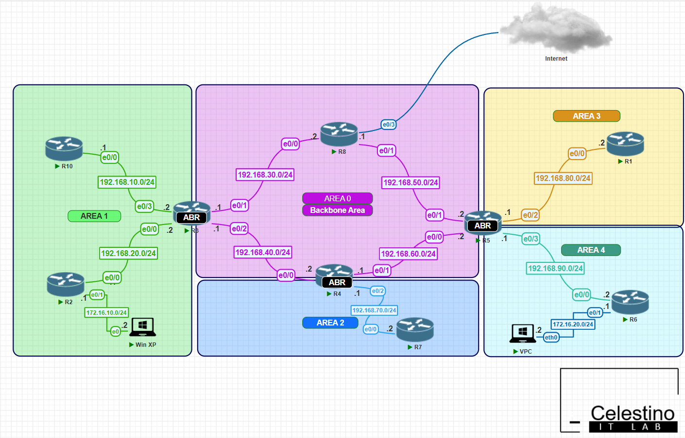 Configurar e validar o roteamento OSPF Multiárea com topologia baseada em cinco áreas: Área 0 (Backbone), Área 1, Área 2, Área 3 e Área 4. A topologia interliga 10 roteadores, com ABRs entre áreas e anúncios de rota default. O objetivo é garantir comunicação eficiente, segmentação adequada por área e redistribuição controlada de rotas.